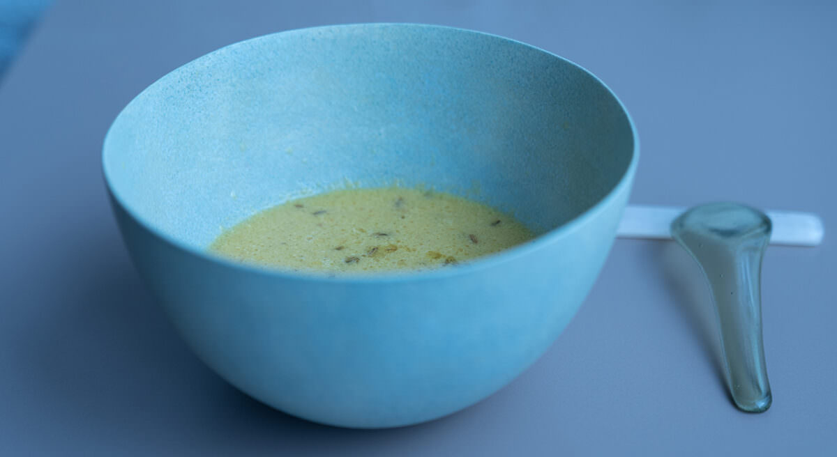 5.岩塩で味をつけ、器に持ってから、ギーと共にタルカしたフェンネルシードを加える。お米やチャパティ、パンを添えていただく。