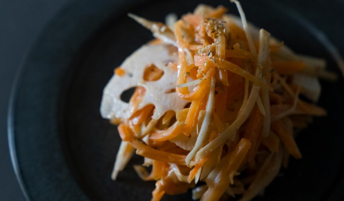 1. ごぼう・人参は千切りに、蓮根は薄く輪切りにしておきます。