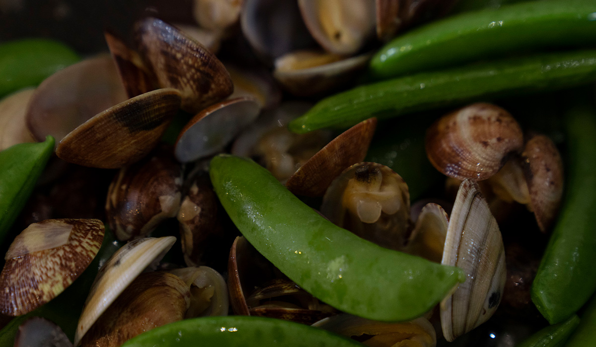 4. 貝が開いたらスナップエンドウやアスパラガスを加えて塩を加えて味を整えます。刻んだパセリを載せて召し上がれ。