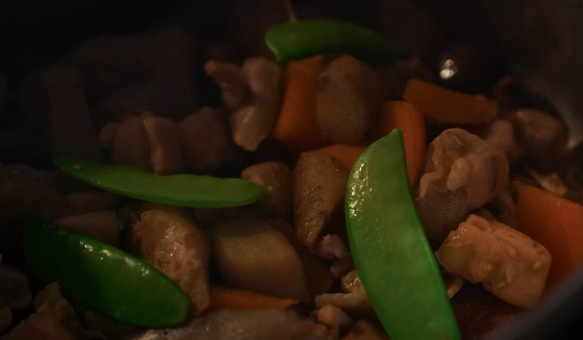 6. 椎茸の戻し汁1/2カップ・みりん・醤油・きび糖を加えて全体になじませ、煮ていきます。煮汁が半分程度減ったら、絹さやを加えて1分程度したら火を止めます。絹さやに火が入り、鮮やかな色になったら完成です。