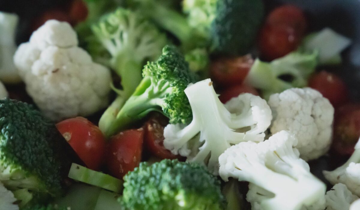 3. 2のフライパンにカリフラワー・ブロッコリー・ミニトマト・塩・オレガノを加えて、全体を混ぜ合わせ、蓋をして蒸し焼きにします。