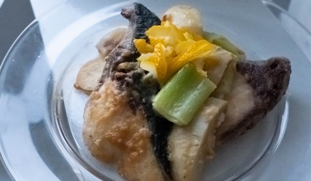 6. 同じフライパンで里芋・スライスした生姜を加えて、水を里芋が半分隠れる程度加えて火にかけます。沸騰し、水の量が半分くらいになったら長ネギを加えます。野菜に火が入ったら、ゆず味噌を加えます。加える量はお好みで調整してください。
