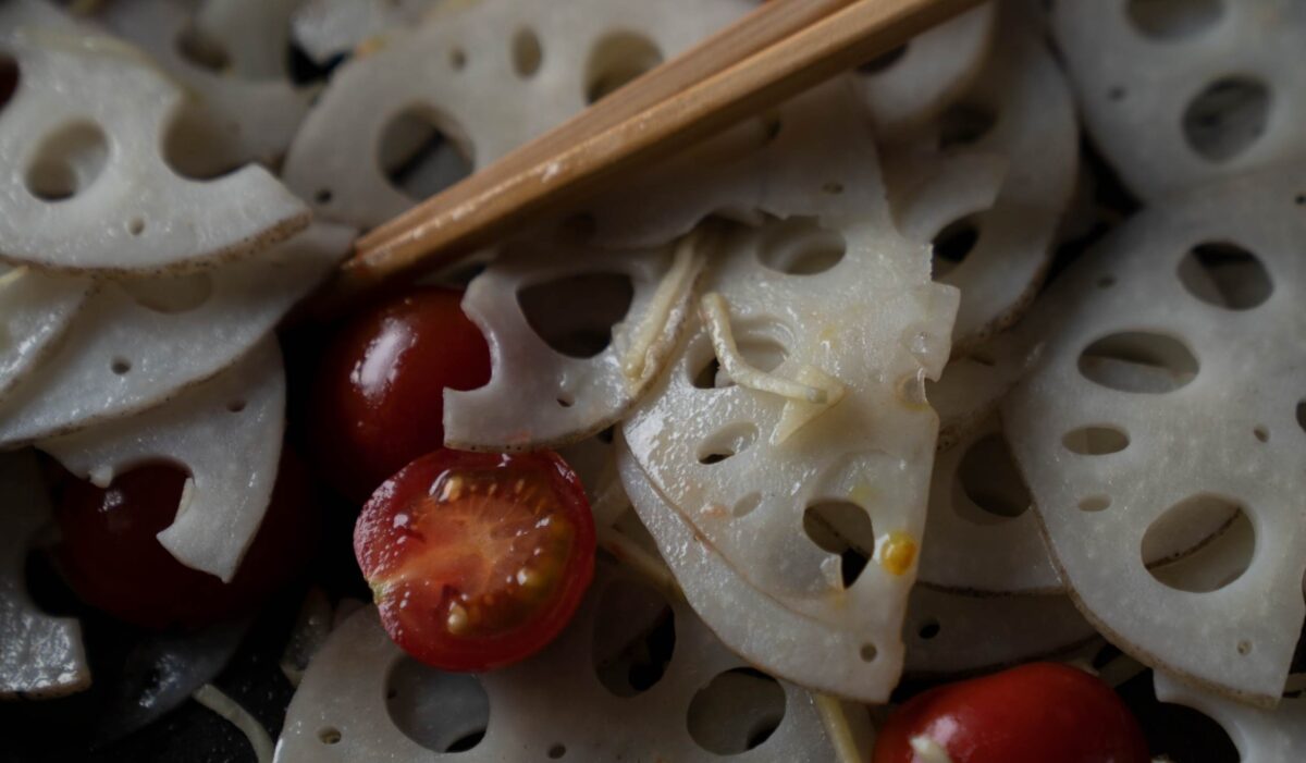 1. レンコンは薄くスライスします。ミニトマトは半分にカットし、生姜は千切りにします。フライパンにごま油を加え、生姜・蓮根を加えて炒めます。