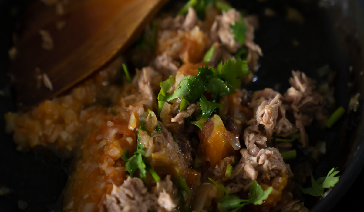 4. ある程度煮詰まったら、ツナ・アンチョビ・パクチーを加えてさらに煮詰めます。
